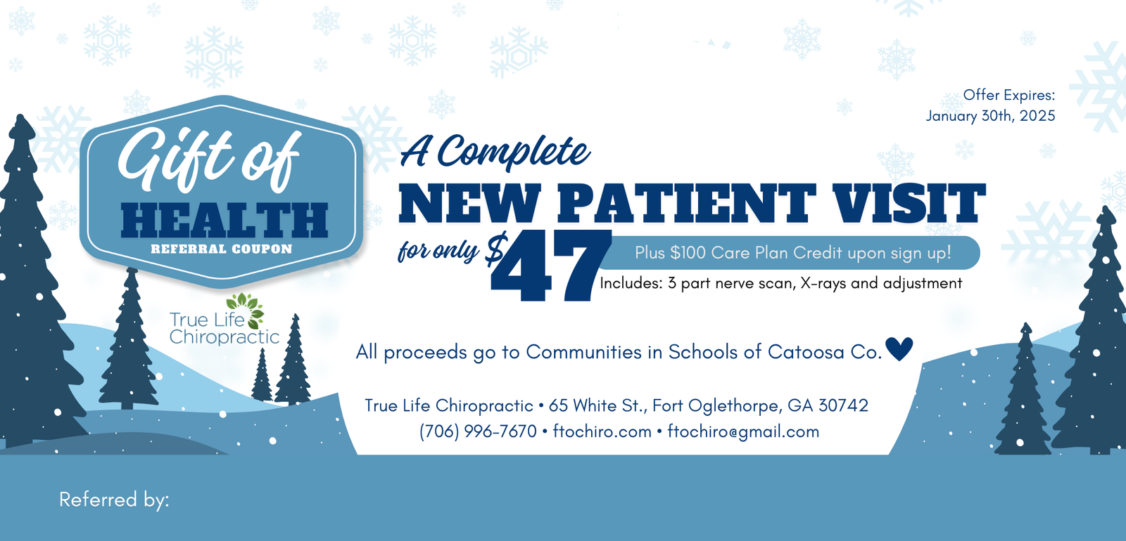 Thank you for checking out the Gift of Health at True Life Chiropractic. This is something we do every year to help bring the gift of health to our community. It's opportunity to bless someone with the a chance to change their health with the first visit at our office and it only cost $47. This first visit includes consultation, exam, x-rays and first adjustment plus all of the $47 gets donated straight to Communities in Schools in Catoosa County. This organization's mission is to keeps kids in school so they can achieve great things in their lives and our community.